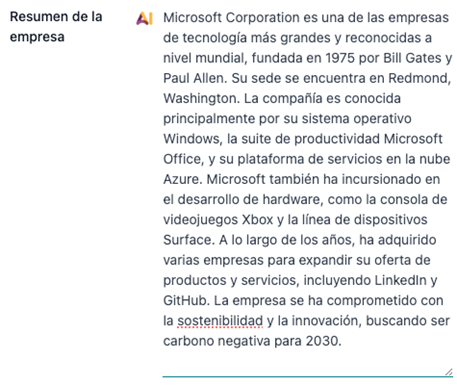 Field configuration with AI "Company Summary": This field will define basic information about the company by conducting an internet search thanks to the activation of the configured language model, based on the company name and other dynamic fields defined in the prompt.